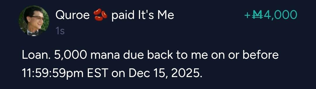 I loan 4,000 mana to you now, with 5,000 mana repaid to me by 11:59:59pm EST on Dec 15, 2025. Acceptable?