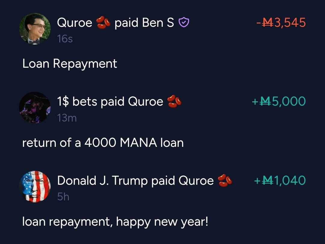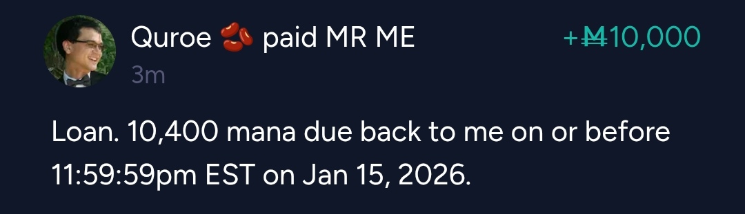 I accept y0ur loan of 4,000 mana now, and i will need to pay u back 5,000 mana on or before 11:59:59pm EST on Jan 4, 2026. 25% - ok I loan you 4,000 mana now, and i will need to pay you back 5,000 mana on or before 11:59:59pm EST on Jan 4, 2026.