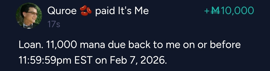 I loan 10,000 mana to you now, with 11,000 mana repaid to me by 11:59:59pm EST on Feb 7, 2026. Is this acceptable?