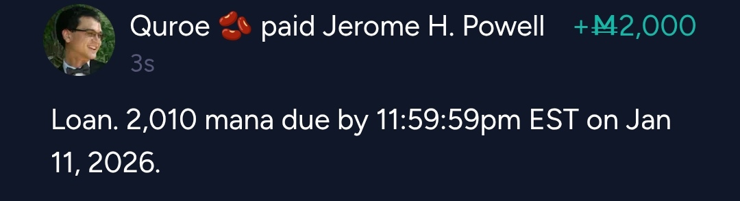 @JeromeHPowell - Loaned 2,000 mana. 2,010 mana due back on or before 11:59:59pm EST Jan 11, 2026. Naked loan, no policy