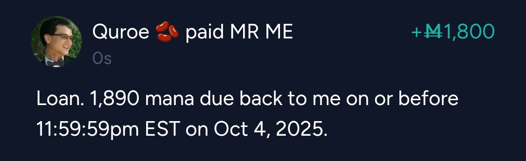 Loaned 1,800 mana. 1,890 mana due on or before 11:59:59pm EST Oct 4, 2025. Naked loan, no policy.