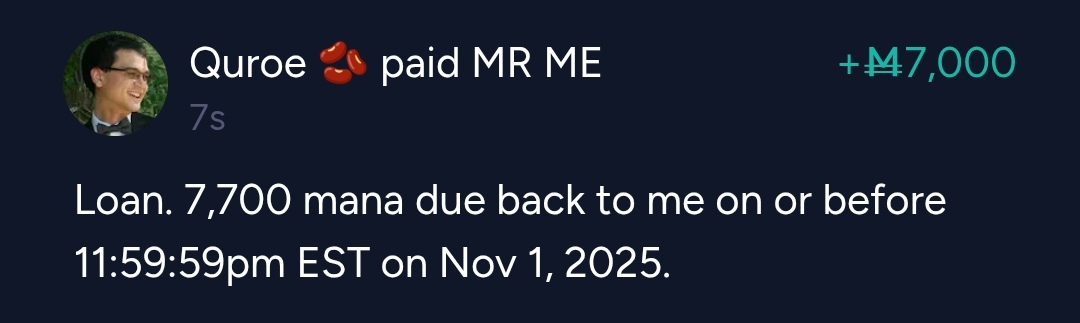 I loan 7,000 mana to you now, with 7,700 mana repaid to me by 11:59:59pm EST on Nov 1, 2025. Acceptable?