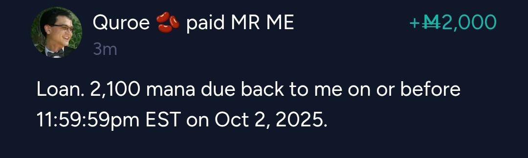 2000 mana loaned to you now, with 2100 mana due back on or before 11:59pm EST on Oct 2, 2025.