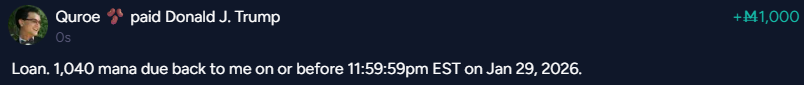 @realDonaldTrump - Loaned 1,000 mana. 1,040 mana due on or before 11:59:59pm EST Jan 29, 2026. Naked loan, no policy.