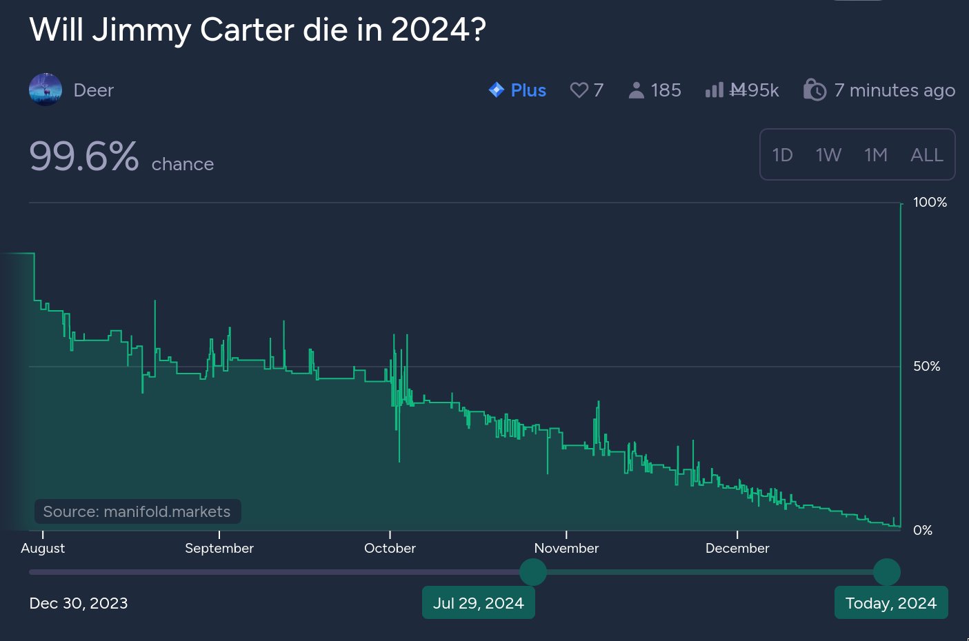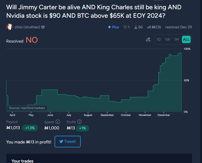 On 9/29/23, next shutdown in 2025 was at 0.1%. It was all on 2023 or 2024. While I it was reasonable to expect a shutdown before 2025, this was still way way overconfident. I bought it up to 1.9%, then chickened out and sold back to 0.7%. Should have had more faith in my analysis.