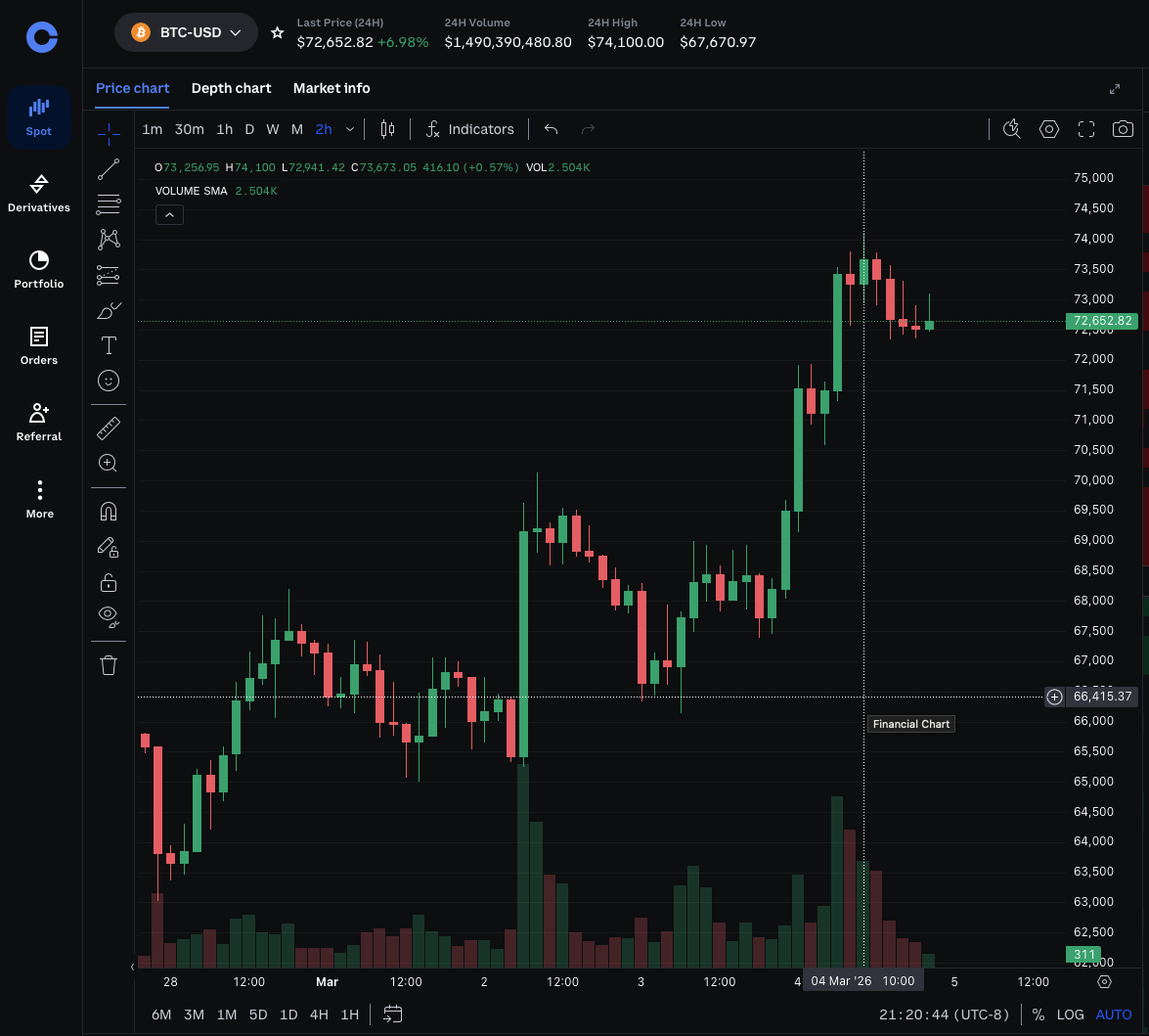 This market resolves to “Yes” if, from March 1, 2026 at 12:00 AM PT through March 31, 2026 at 11:59 PM PT, the BTC/USD spot price never trades below $60,000 USD and never trades above $74,000 USD, as determined by 1-minute candlestick data.