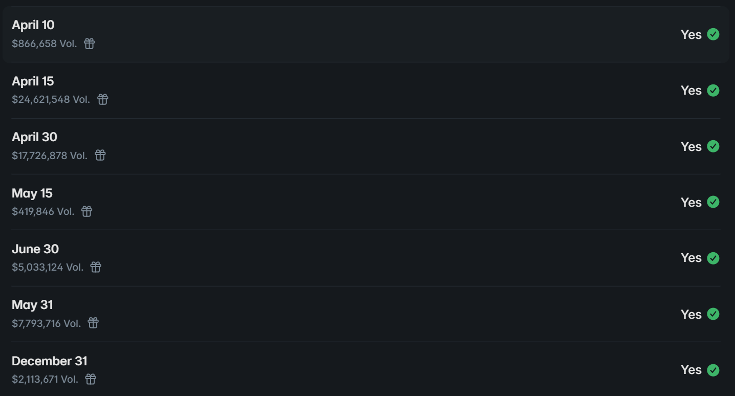 @prismatic Polymarket has resolved all except for April 7th (which is in dispute and not in this market regardless), although April & June only have 30 days lol.