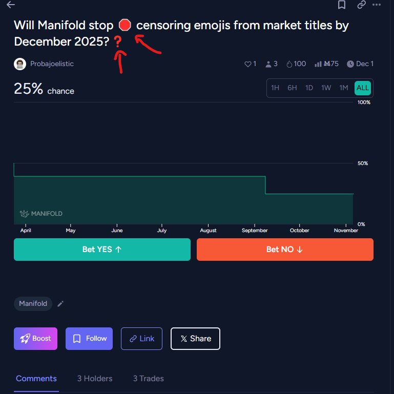Will Manifold stop π censoring emojis from market titles by December 2025?β
