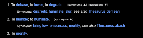 @robert You said "that is what I find the word demeaning to mean," but you haven't said what you think it means. Do you have a meaning other than the dictionary definition?