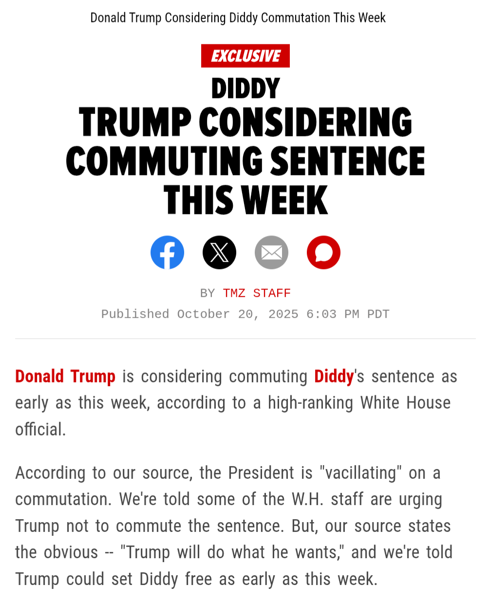 According to TMZ, Trump is considering commuting P Diddy's sentence as early as this week: