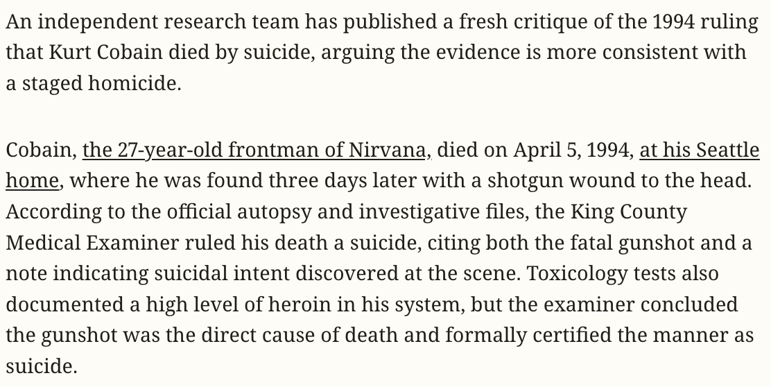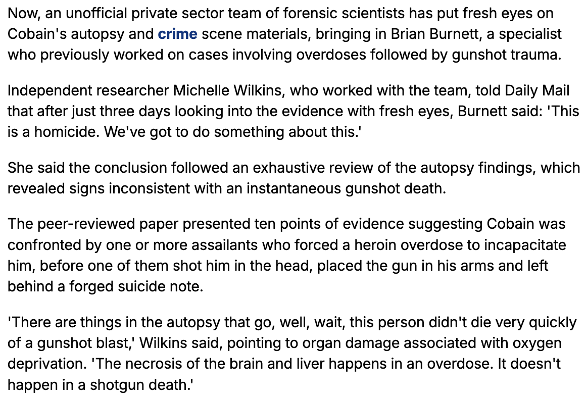 Articles published today in multiple news outlets have re-opened the debate about Kurt Cobain's cause of death in 1994. Officially ruled a suicide, theorists have long speculated (insisted) he was murdered.