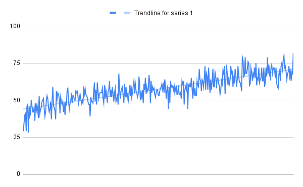 Zetamac is a typing speed test platform where users compete in timed rounds. Your current personal best is 82, achieved after approximately 300 two-minute rounds of practice. Reaching 100 represents a roughly 22% improvement over your existing best performance.