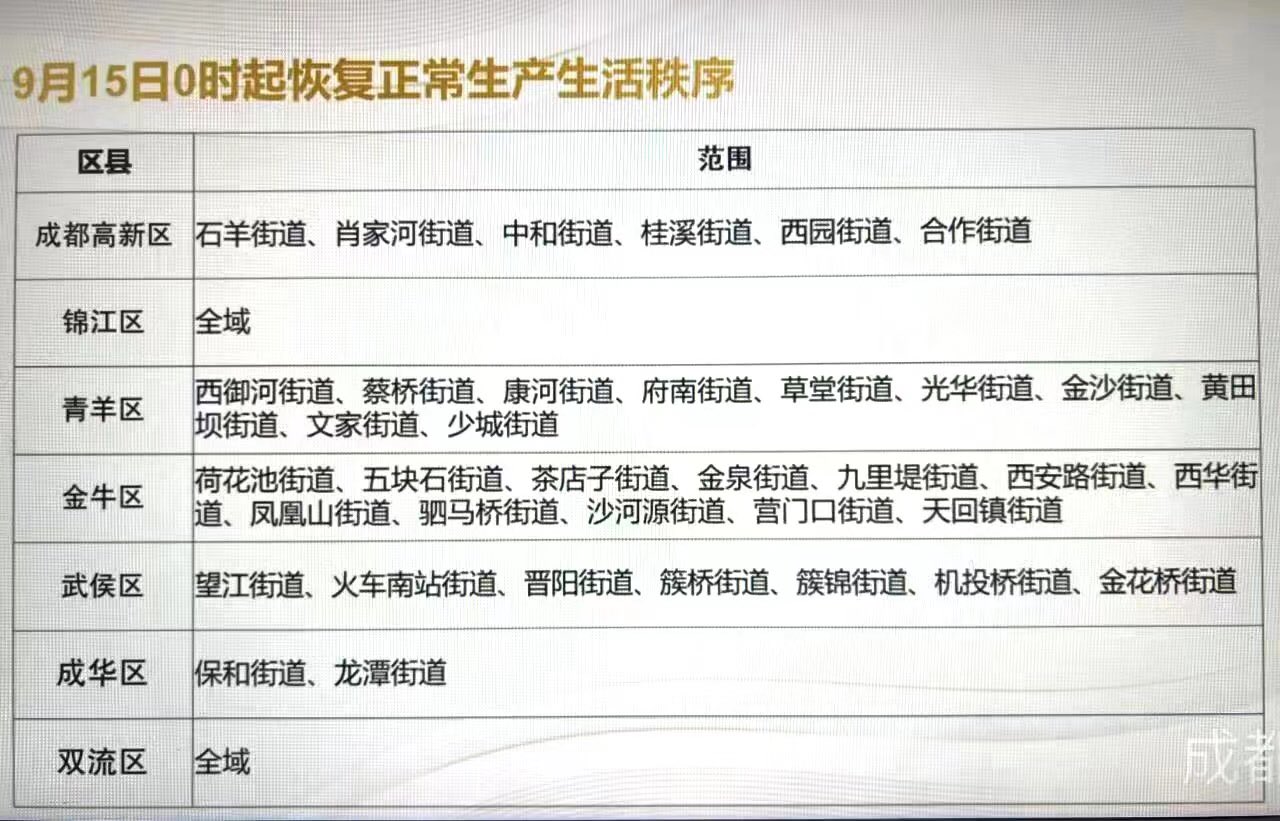 Sept.12: City officials say they are planning to lift restrictions in several areas of the city starting on Monday. These areas contain approx 11.1% of Chengdu's population according to https://en.wikipedia.org/wiki/Chengdu Colored admin divisions as below.