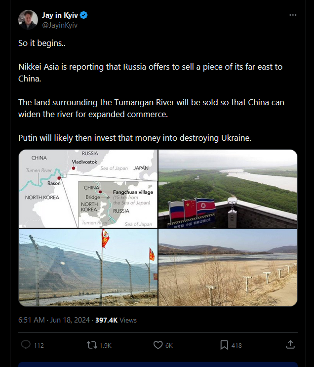 Will 10+ acres of land surrounding the Tumangan River be sold from Russia to China by the end of 2024?