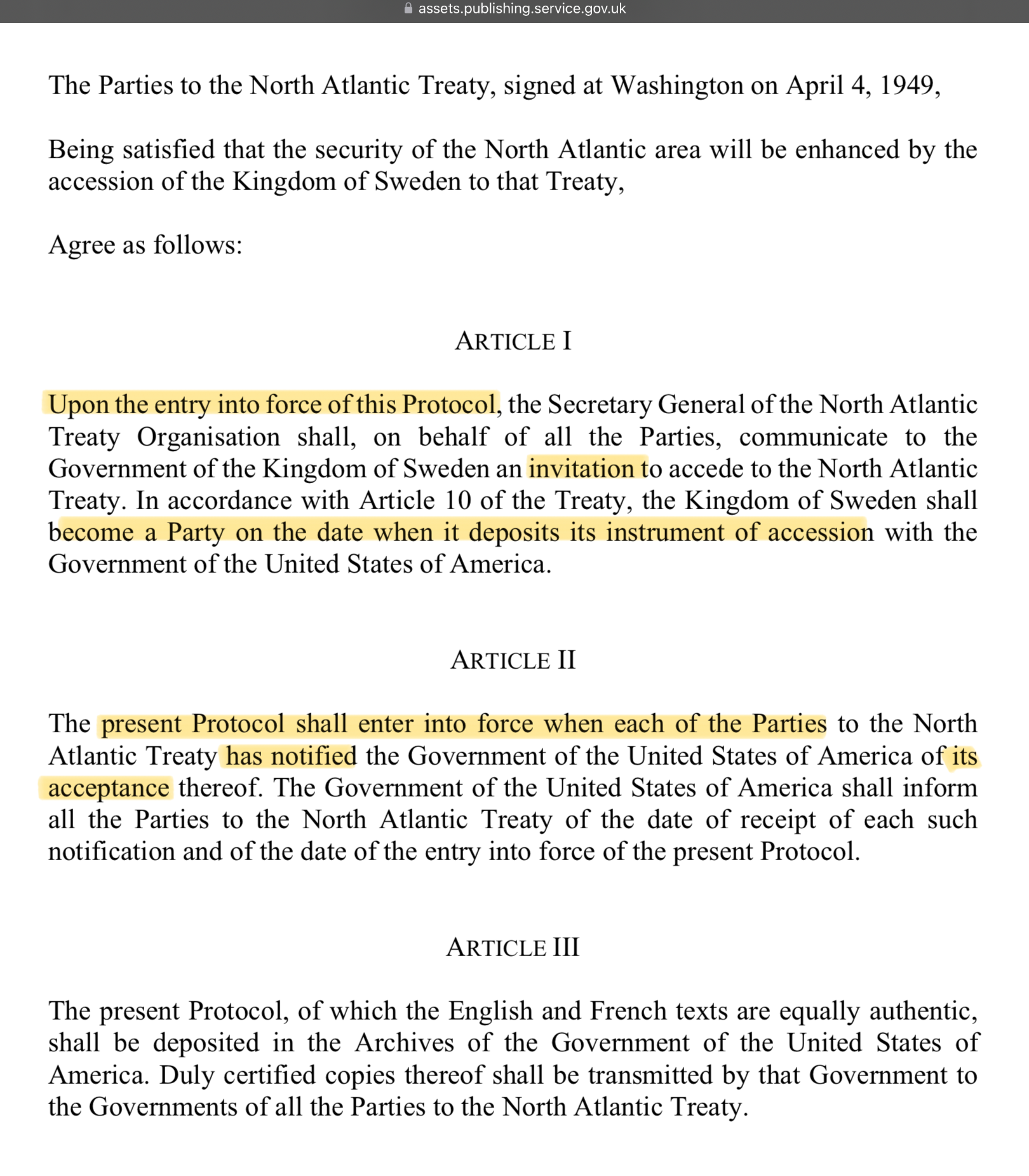 @strutheo for those saying the deposition makes them members, there need to be TWO depositions: Hungary’s deposition of ratification, which does not automatically make Sweden members, and Sweden’s deposition of accession, which does grant membership.