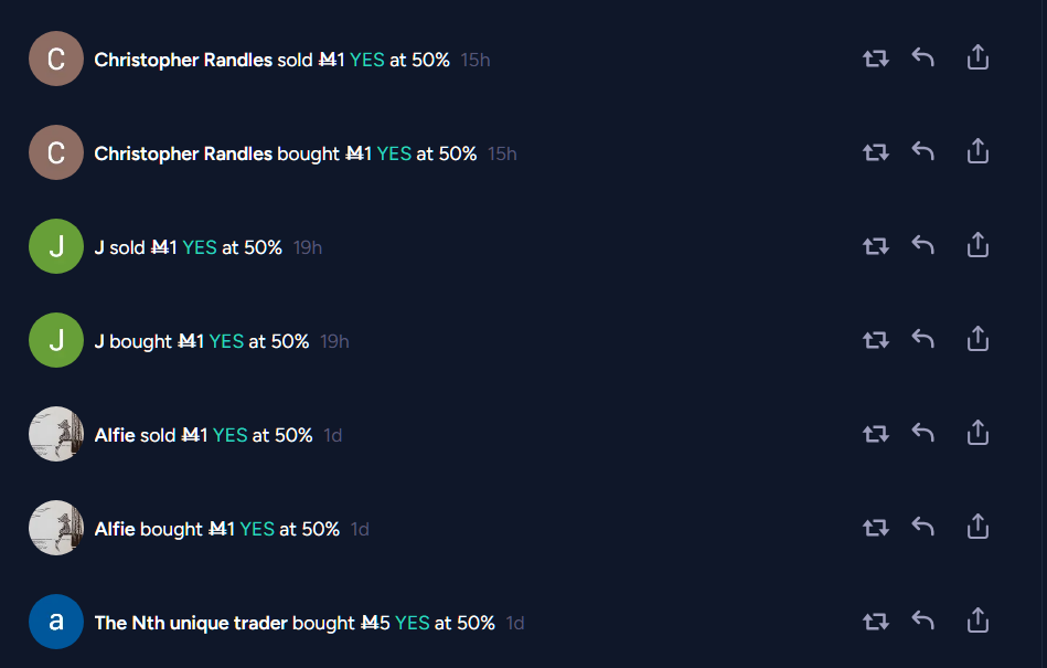 For free play, make a trade with 1 mana and sell it. Your trade will be recorded and you will become a unique trader. This market will resolve to 50%.