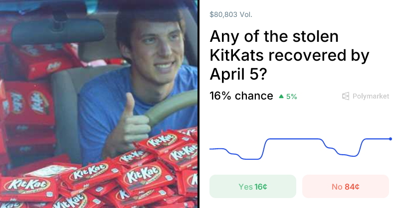 This market will resolve to “Yes” if any KitKat bar stolen during this incident is recovered by Nestle, a Nestle affiliate, or a relevant government or law enforcement authority by the listed date, 11:59 PM ET. Otherwise, this market will resolve to “No”.