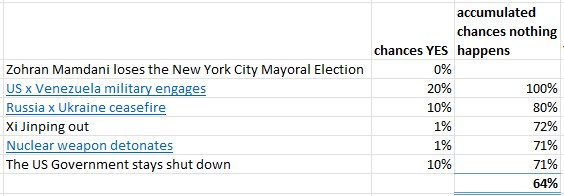 We have 7,5 weeks left in 2025, and Polymarket gives 6% chance. For the 3 weeks left in November, this would be 2-3%