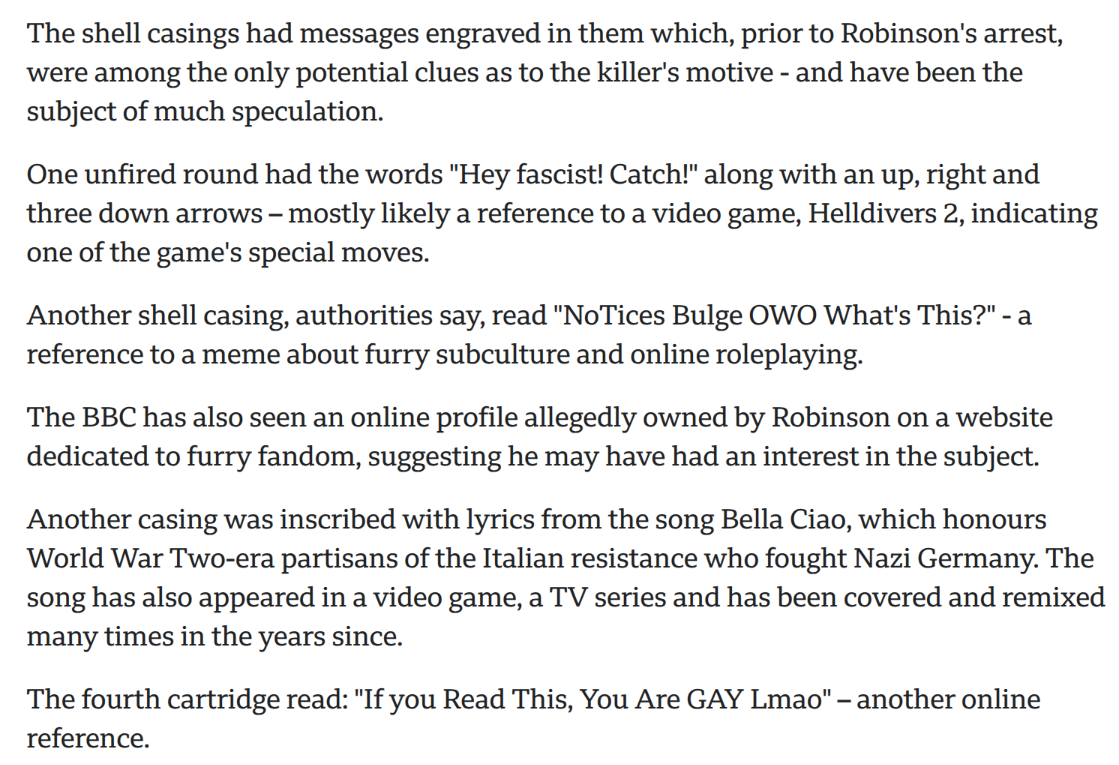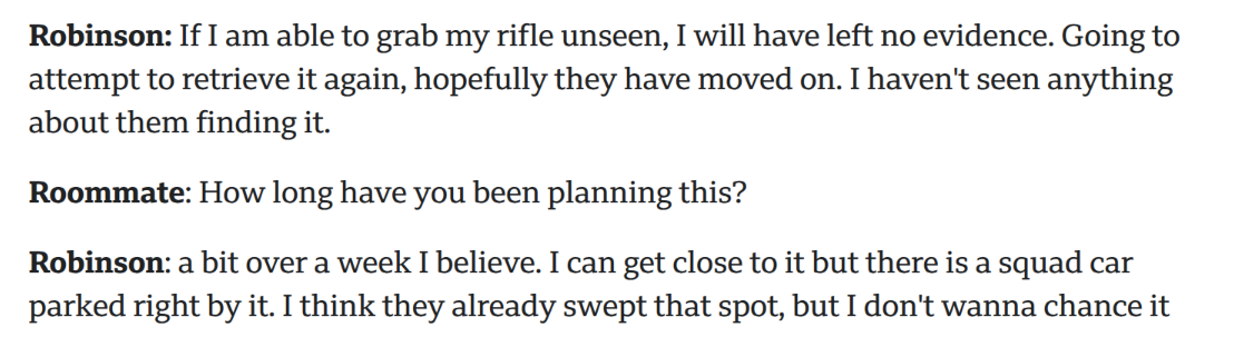 @Dulaman Yeah, exactly. Obviously if these were fabricated by the FBI/police, it would be easy to disprove in court, but I would assume FBI would otherwise figure out quickly if these were manufactured by the shooter and roommate from timestamps etc. Looking at the document, they seem to be only including some of the messages as there are a lot of ... around. There are those even within messages, so it seems they omitted some of the data.