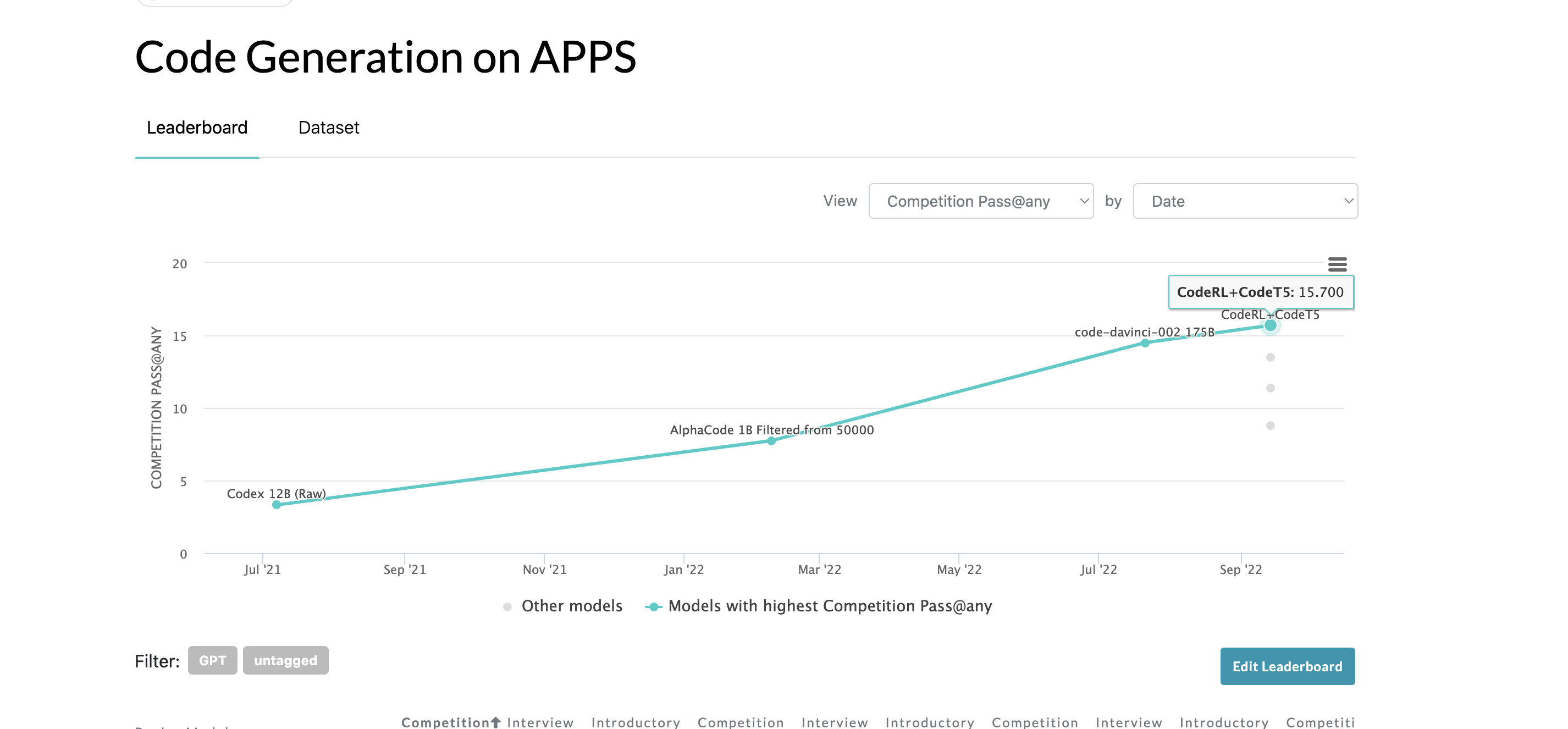 APPS is the more challenging code benchmark (compared to HumanEval). SOTA at market creation is 15.7 by CodeRL. I will use Competition Pass@any.
