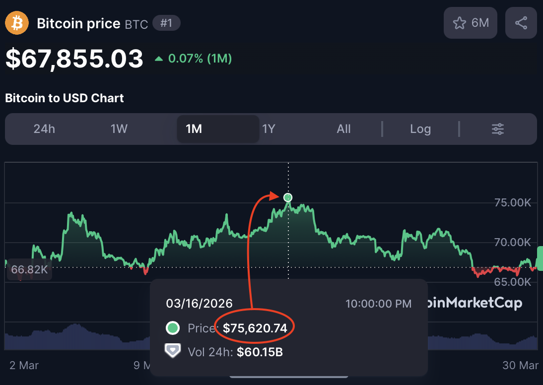 This market resolves YES if Bitcoin's price reaches or exceeds a specific price target before March 31, 2026 at 11:59 PM UTC. Resolution will be determined by the highest price Bitcoin trades at on any major exchange (Coinbase, Kraken, Binance, or similar tier-1 venues) during the specified timeframe. The resolution price should be verified using historical price data from CoinGecko or CoinMarketCap, which aggregate prices across major exchanges.