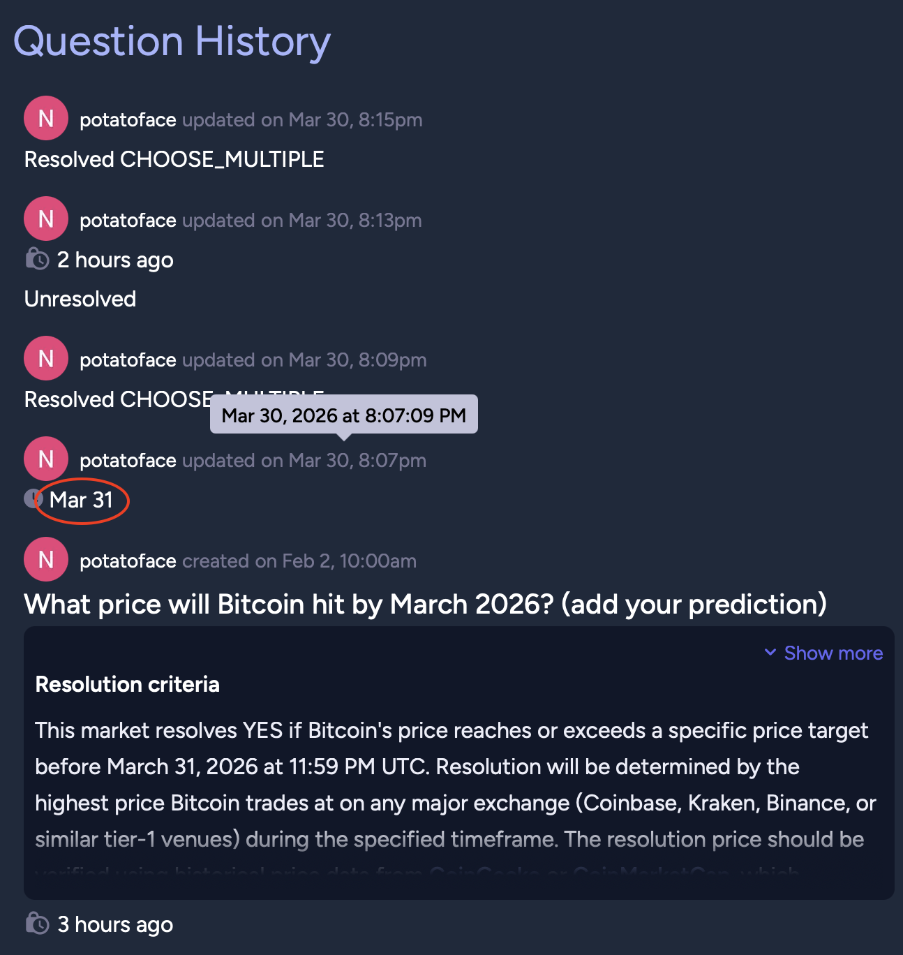 Edit: it's even worse, the market had closed so they extended for a day (makes sense to end of March) and then immediately made the fraudulent bets and resolved to MULTIPLE (then unresolved and re-resolved for whatever reason).
