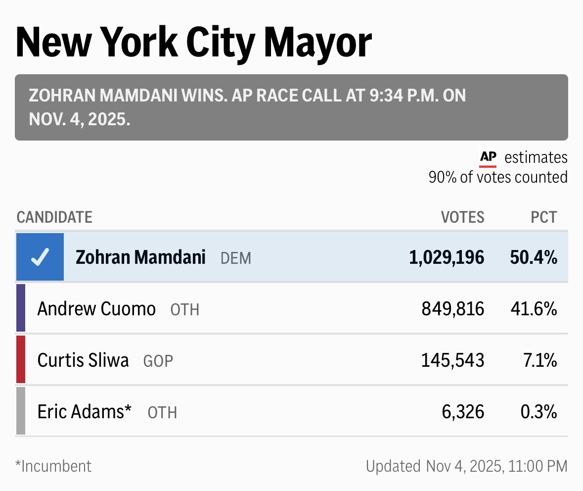 Right now, with ~90% of votes counted, AP estimates Mamdani has just over 50% of the vote: