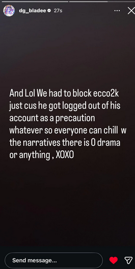 Drain Gang is a Swedish music collective with core members Bladee, Ecco2k and Thaiboy Digital. Ecco2k has seemingly blocked/unfollowed Bladee, Thaiboy Digital, Yung Lean and various others on Instagram/Twitter. At time of market creation, this happened a few hours ago and it is unclear what is happening.